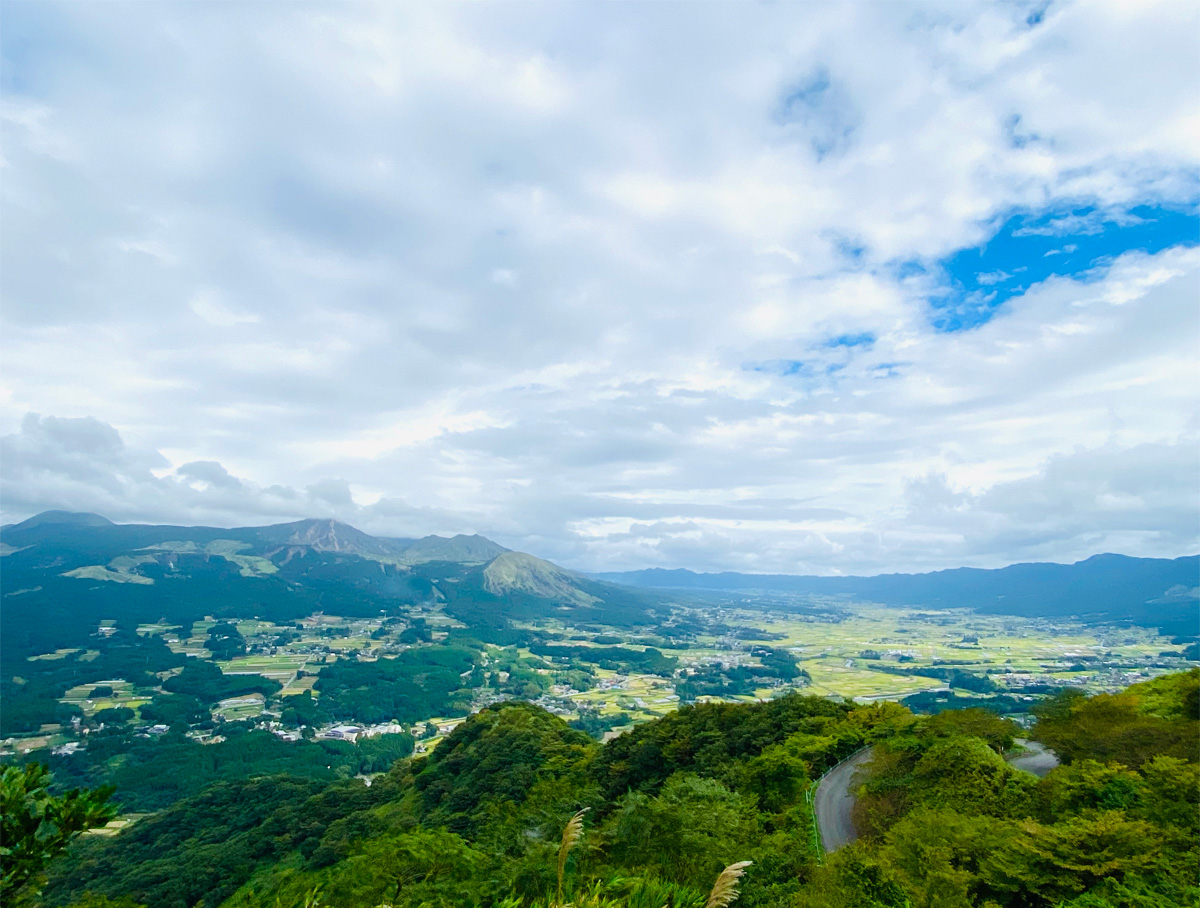 県道28号沿いに位置。道路脇の駐車場から山道を少し進むと、標高710mの展望所に到着します。展望所からは九重連山から米塚、阿蘇五岳や外輪山、阿蘇谷、南郷谷といった阿蘇全体が望める絶好のロケーション。条件がそろえば雲海も見られるかも? 俵山山頂へ向かう遊歩道も整備されており、トレッキングも楽しめます。