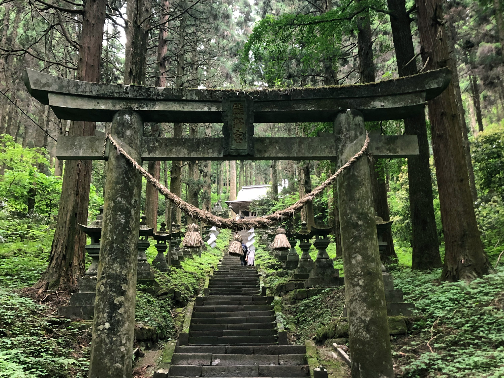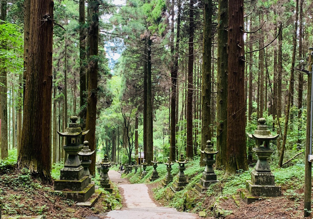 創建は鎌倉時代末期~室町時代といわれ、伊弉諾尊、伊邪那美尊と阿蘇大明神の荒魂「石君大将軍」が祀られています。もともとあった磐信仰と修験者がもたらした熊野信仰とが結びつき、「穿戸権現 熊野宮」と呼ばれるようになりました。参道には100基近い石灯籠が並び、深い緑の苔に覆われた風景は、アニメの世界に迷い込んだかのよう。鳥居から神殿へと続く石段を歩むほどに、心身が浄化されていくような不思議な感覚を覚えます!